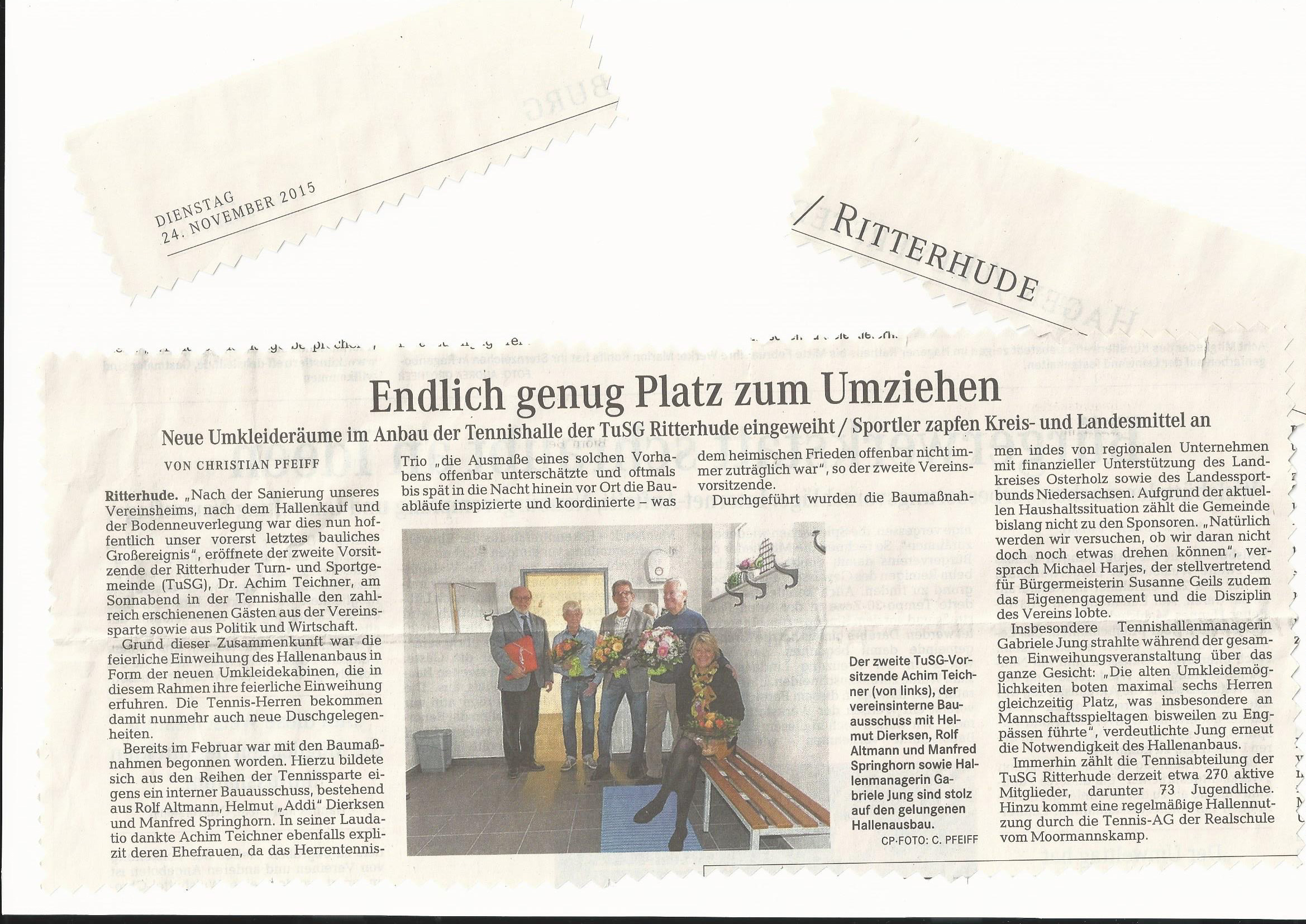 Am Samstag 21.11.2015 feierte die Tennissparte der TuSG Ritterhude in Anwesenheit von Vertretern aus Politik, Sport und Wirtschaft die Eröffnung der neu erstellten Sozialräume ihrer Tennishalle.